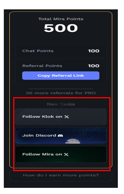 트위터 및 디스코드에 가입하여 Task를 완료하면 추가로 Mira 포인트를 획득할 수 있습니다.