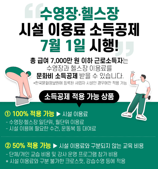 7월 1일부터 헬스장이나 수영장 이용료에 대해 연간 최대 300만 원 한도로 30% 소득공제를 받을 수 있습니다. 총급여 7,000만 원 이하 근로자라면 꼭 챙겨보세요. 건강도 챙기고 세금도 아낄 수 있는 좋은 기회입니다.