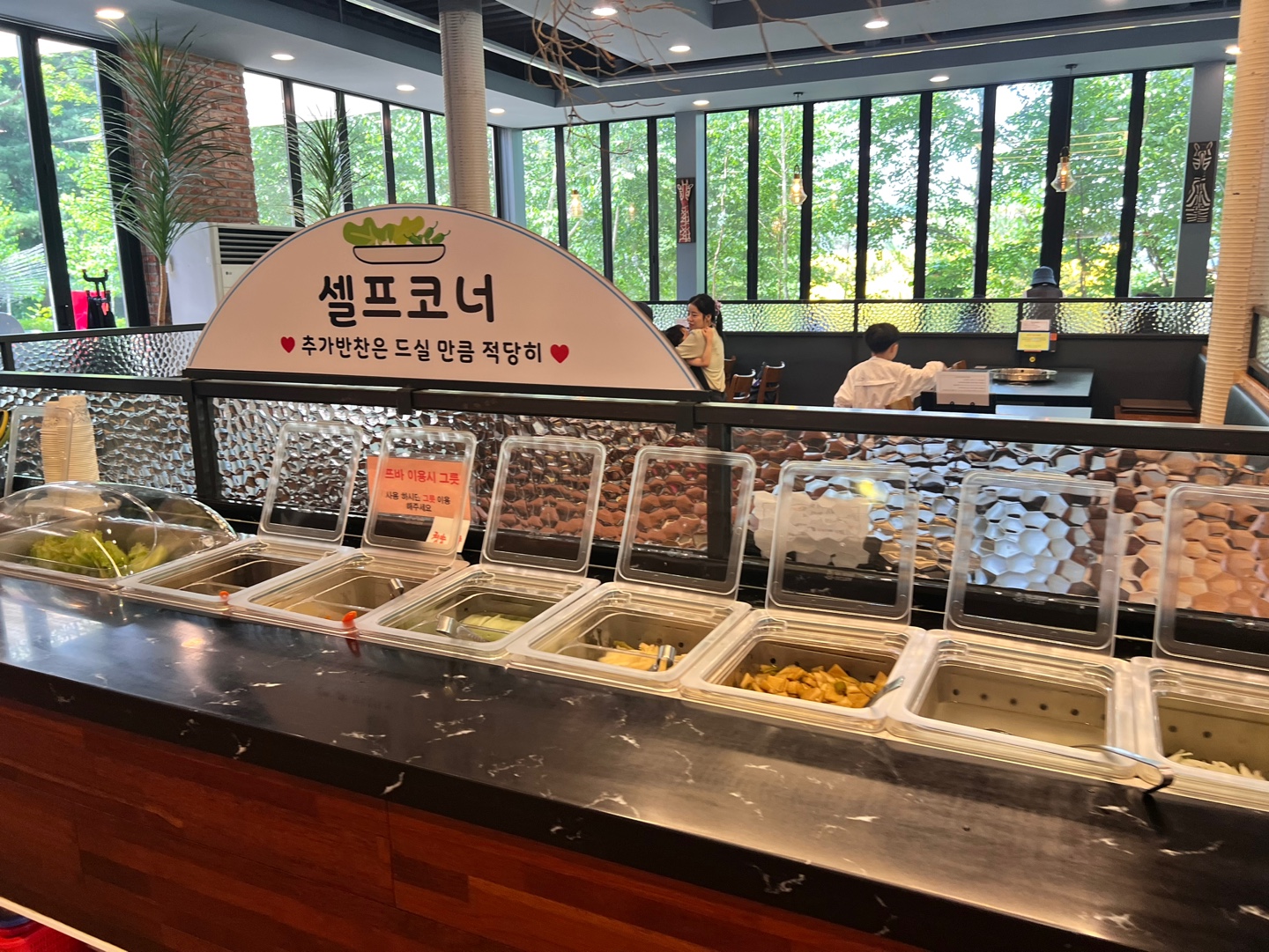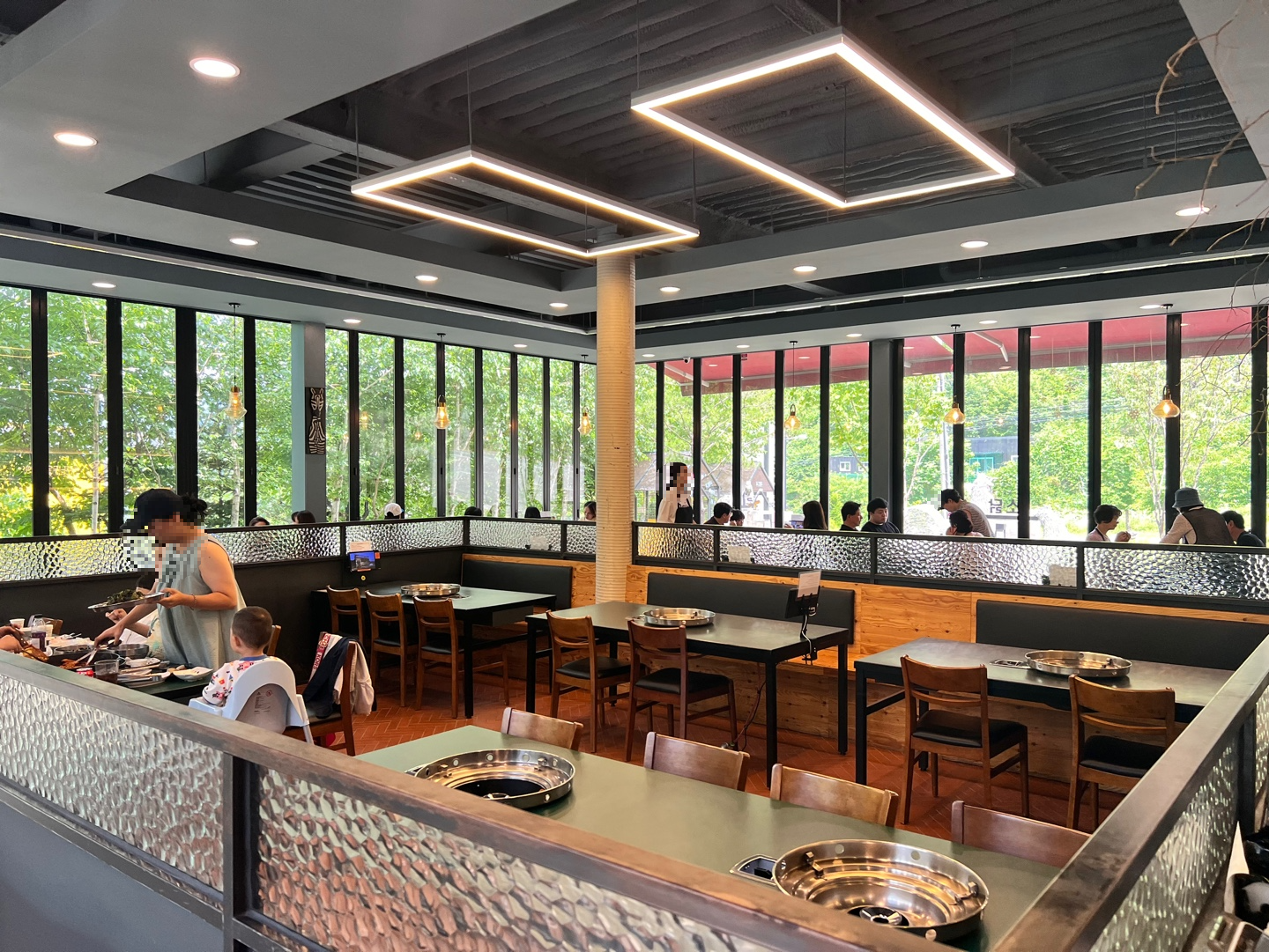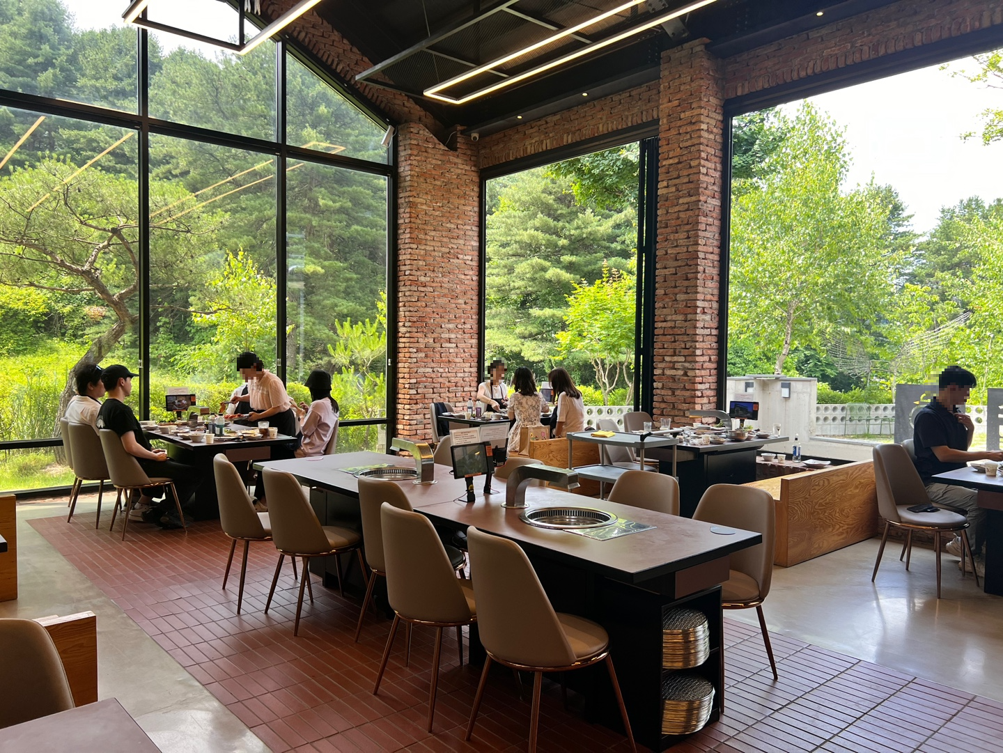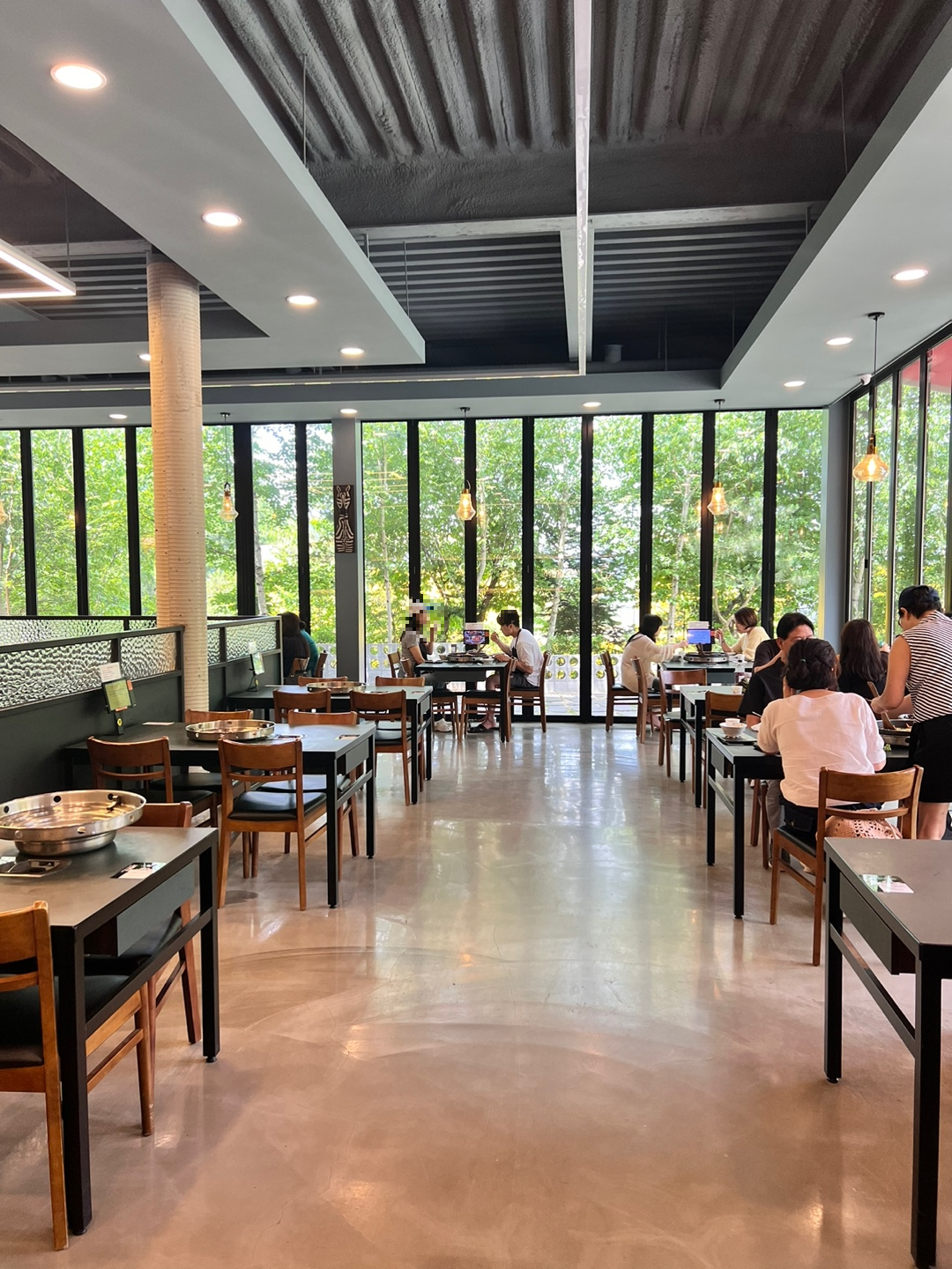 여기가 철판을 먹는 곳이에요. 주변이 통창이고 초록초록한 나무숲에 둘러싸여 있어요.