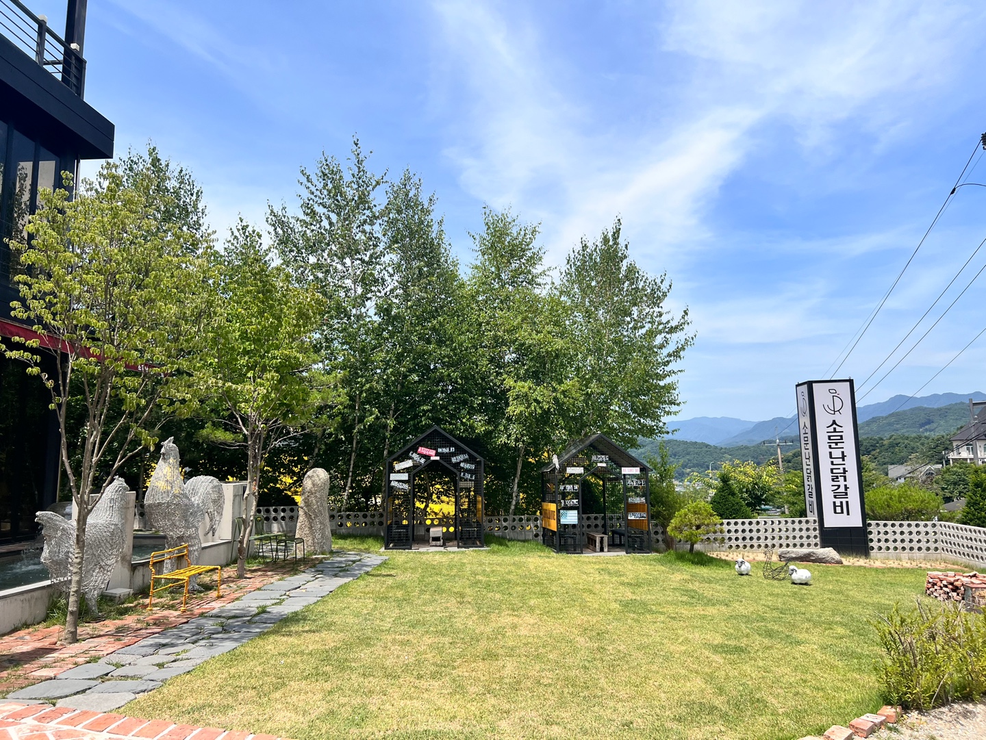 이쪽은 숯불닭갈비 자리예요. 넓은 탁자가 준비되어 있고 여기도 뒤로 보이는 산과 나무가 푸르르죠.