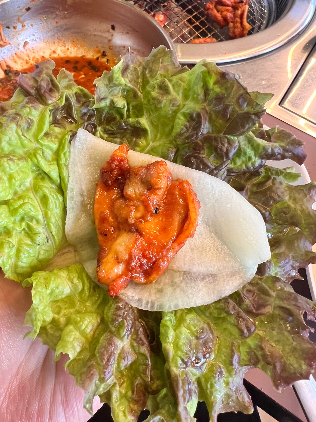 잘 익은 고기를 상추랑 쌈무랑 같이 싸서 먹었어요. 요 조합 너무 맛있더라고요!