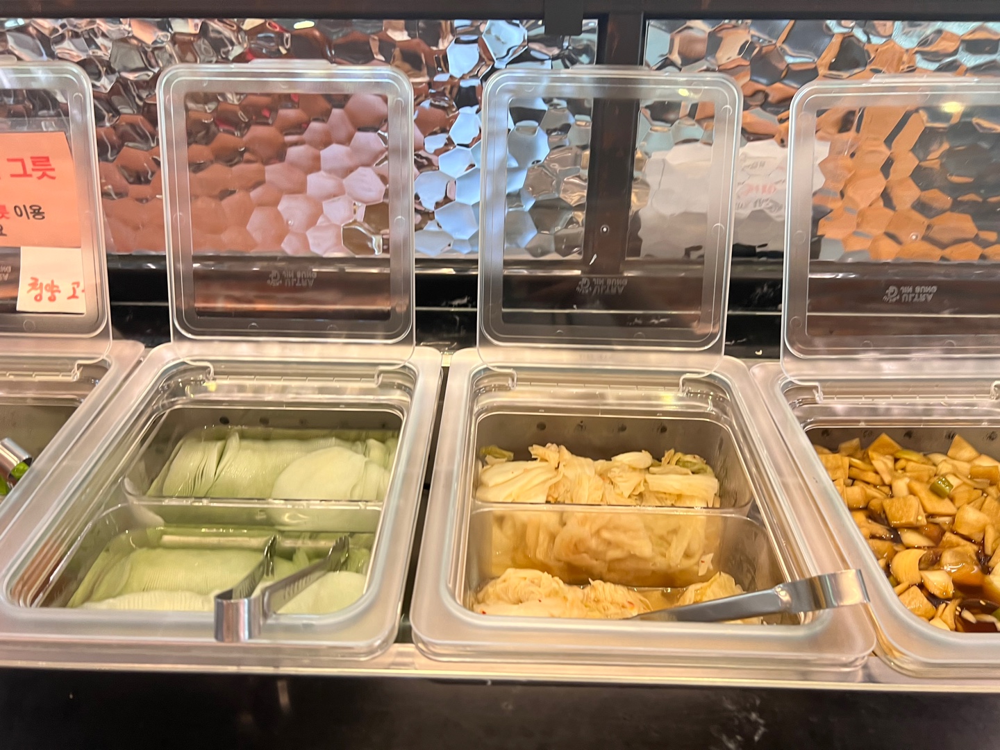 동치미, 상추, 쌈무, 양파절임 등 기본찬들을 세팅해 준 후 추가 반찬은 셀프로 먹어요.