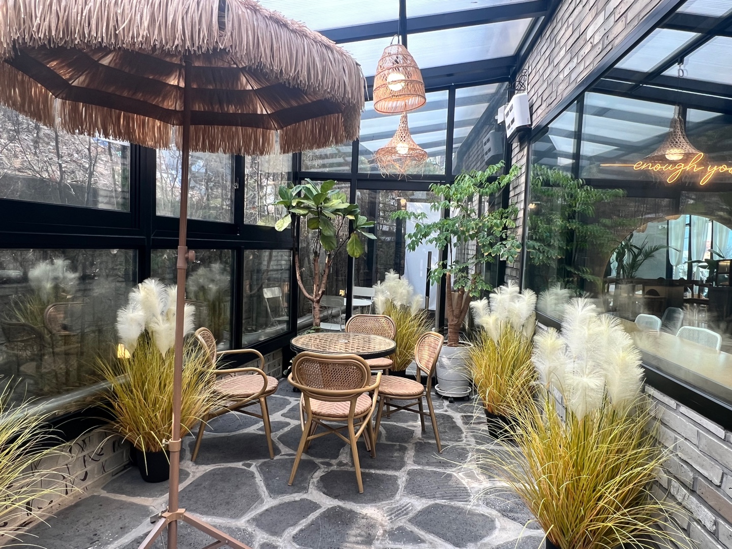 내부 공간 중에 테라스 쪽은 감성 낭랑한 파라솔로 꾸며져 있는데 이국적인 느낌이 가득했어요.