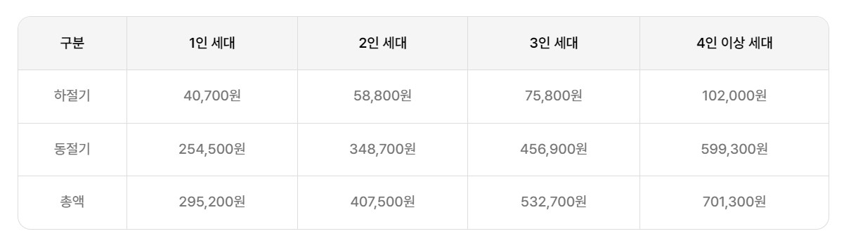 에너지 바우처 지원 금액은 하절기와 동절기가 다르고 세대원의 숫자에 따라서도 차등 지급 됩니다.