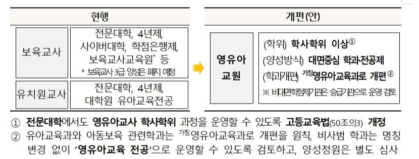 통합 자격은 1안과 2안으로 나눠져요. 1안은 영유아정교사라고 칭하고 0-5세를 아울러 담당하는 것이고