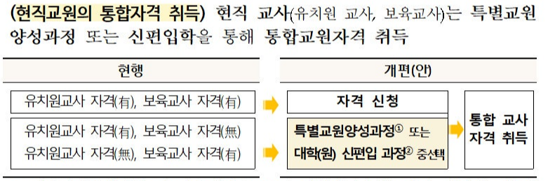 하지만 현재 유치원 자격증만 있거나 보육교사 자격증만 보유하고 있다면 특별교원양성과정이나 대학(원) 신편입 과정 중 선택하여 교육을 듣고 통합 교사 자격증을 취득해야 합니다.