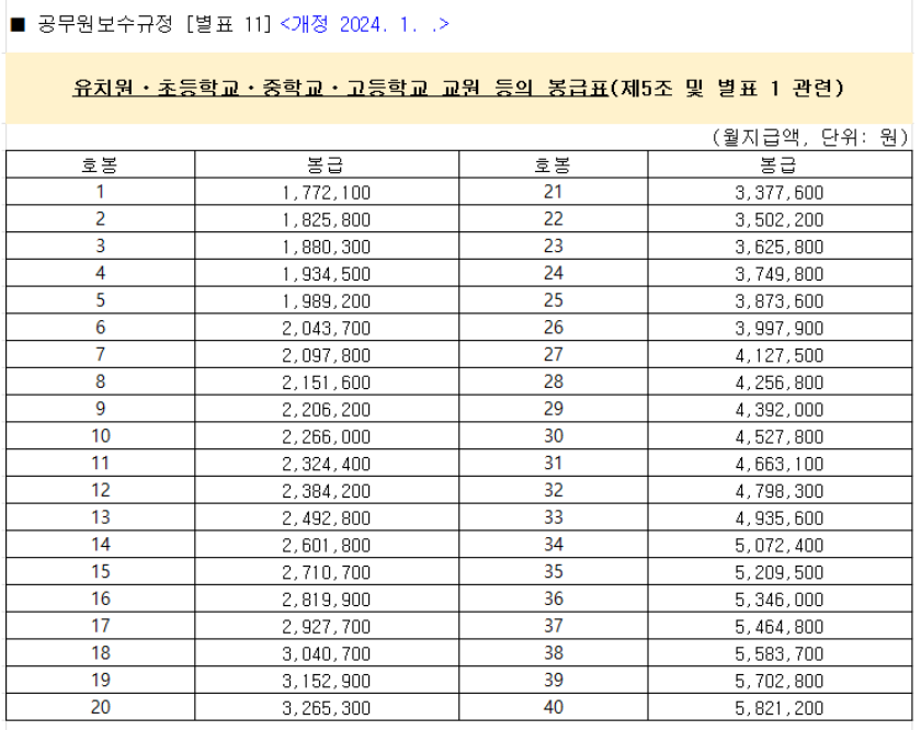 임용고시를 합격하고 국공립유치원에 근무하게 되면 어떻게 될지 궁금하실 것 같습니다. 일단은 교육공무원의 신분으로 근무를 하게 됩니다. 그리고 국공립 유치원 교사의 호봉표대로 호봉 책정이 되어 급여를 받게 됩니다. 호봉표는 매년 업데이트되는데 2024년도 호봉표를 첨부해 두겠습니다. 사립유치원에서 근무했던 경험이 있으신 선생님들은 해당 경력에 대한 인정도 받으실 수 있습니다. 역시 국가에서 운영을 하다 보니 정확하고 깔끔한 급여 책정이 이루어지는 것 같습니다. 여기에 담임수당과 교원연구비, 급식비, 정근수당, 명절수당 등 각종 수당이 붙습니다. 결혼을 하고 아이가 있으면 가족 수당도 붙게 됩니다. 하지만 실제 받는 금액은 공무원 연금고 각종 세금들을 제외하고 받게 되기 때문에 조금 더 줄어든다고 보면 됩니다. 국공립 교사의 경우 방학기간을 누릴 수 있다는 큰 장점이 있습니다. 물론 방학기간에 연수를 받기도 하지만 연차를 소진하여 여행을 다녀오기도 하고 휴식을 가질 수 있는 기간이 있습니다. 그리고 점심시간이 근무시간으로 인정받게 되어 8시 30분부터 4시 30분까지 근무를 하고 퇴근합니다. 저녁이 있는 삶을 보낼 수 있다는 게 큰 장점으로 작용합니다. 유아임용고시 티오전망은 아쉽게도 밝진 않습니다. 현재 유아수가 감소하고 있기 때문에 이러한 현상이 발생한 것입니다. 그렇다 보니 서울지역에는 티오가 0이었던 충격적인 해도 있었습니다. 실제로 2022년도 시험부터 티오가 절반 수준으로 급감하여 그 추세가 지금까지 이어져 오고 있습니다. 그전에 이미 많이 뽑아두었기 때문에 티오가 급감하기도 했지만 현재 유아교육뿐 아니라 각 학교단위 모두 학생 수가 감소하고 있는 현상이 있는 것과 같이 원아 수가 감소하였기 때문에 이러한 현상이 이어지고 있는 것으로 보입니다. 티오는 희망적이진 않지만 열심히 하시는 수험생 분들에게 좋은 결실이 맺어지길 바라겠습니다.