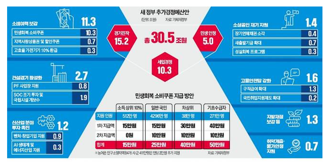 정부는 2024년 하반기 경기 회복과 물가 안정, 내수 진작을 위해 총 30조 5천억 원 규모의 2차 추가경정예산안(추경)을 발표했다. 민생 소비 촉진에 11.3조 원, 건설경기 활성화 2.7조 원, 신산업 및 미래산업 지원 1.2조 원이 배정되어 총체적인 경기 부양을 노린다. 여기서 일반 국민들은 1인당 25만원, 4인 가족 기준으로 총 100만원의 지원액이 포함된다.
