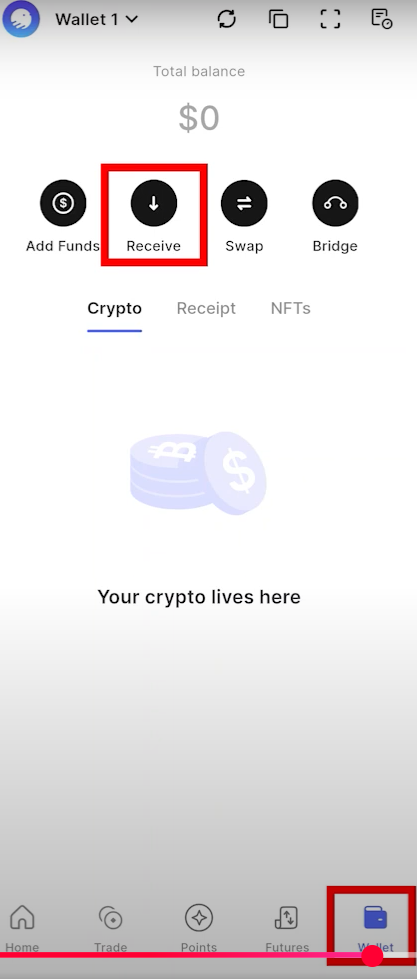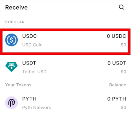 6) 아래 그림과 같이 하단 Wallet부분에서 receive 버튼을 눌러주고 상단의 USDC를 눌러줍니다.