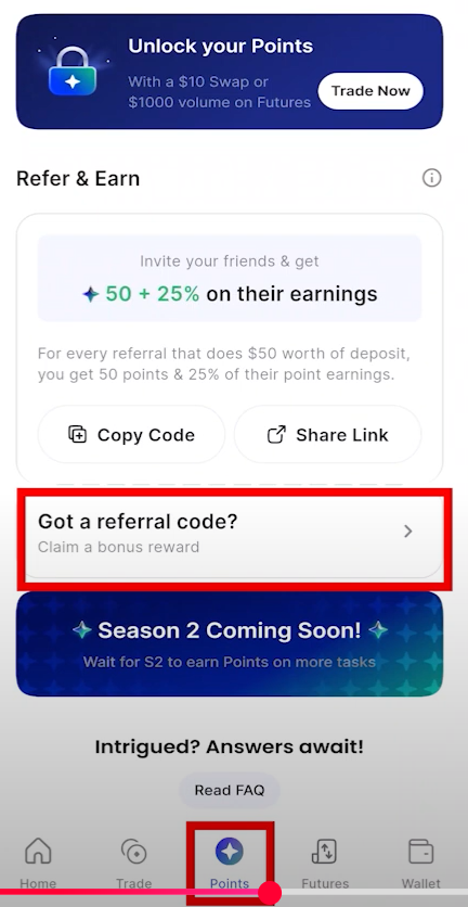 5) 해당 어플을 켜서 들어가면 아래 그림의 Point를 눌러주고 들어가면 Got a referral code를 클릭해줍니다.